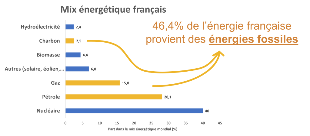 En France c’est légèrement différent, puisque le nucléaire réduit considérablement la part du charbon et en partie de celle du gaz dans le mix global. Cependant, la part du pétrole est identique à celle du mix énergétique mondial. Et il n’y a pas de nucléaire sans pétrole.