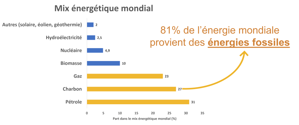 Je dis bien dopée aux énergies fossiles, puisque 80% du mix énergétique mondial provient des énergies fossiles (pétrole, gaz et charbon).
